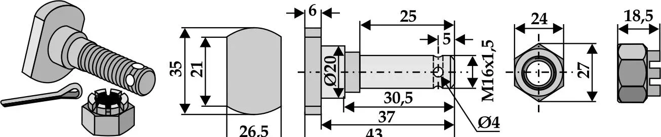 Nožový šroub M 16 x 1,5 x 37 s hradlovou maticí