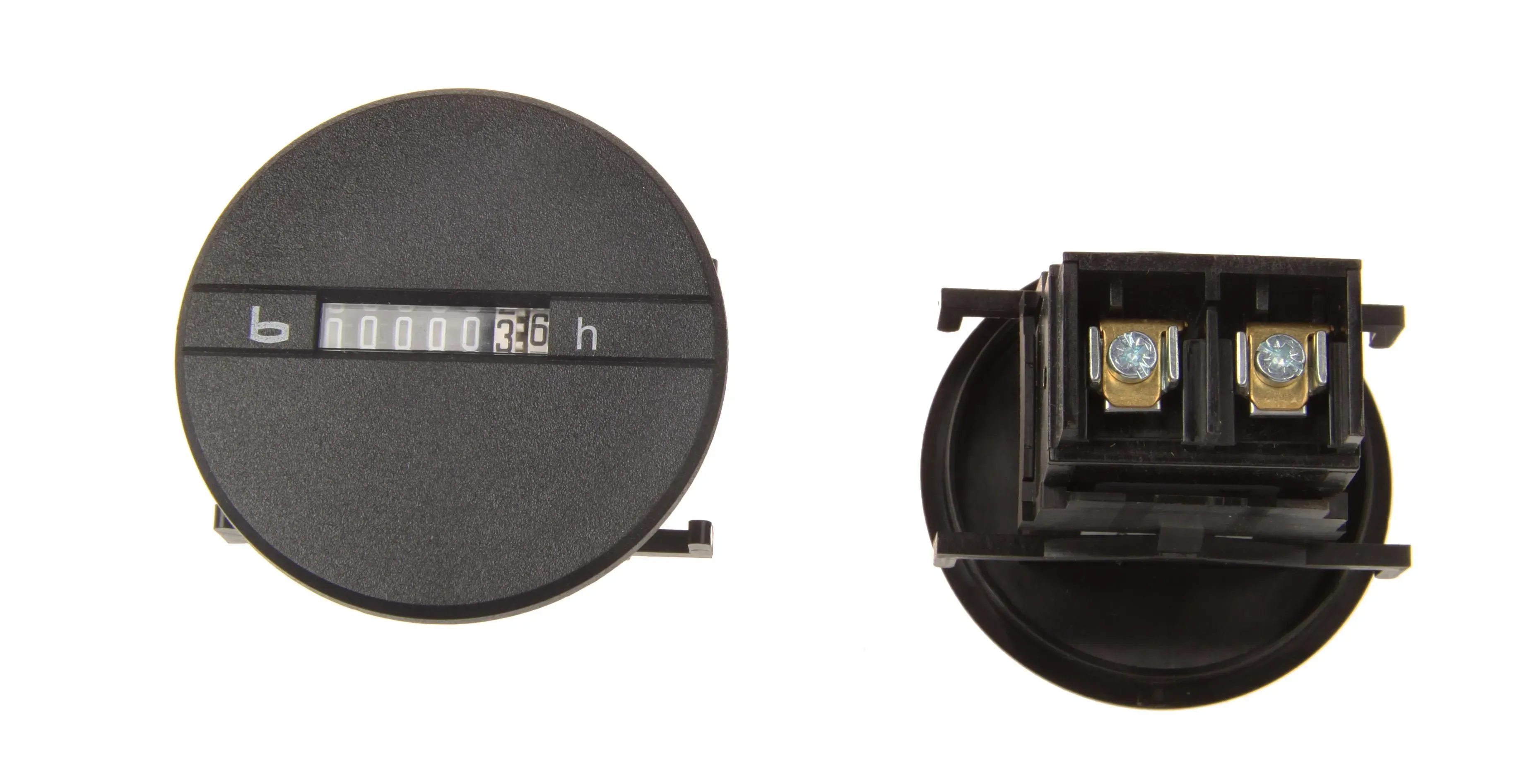 black, terminal connection 90° bent (short-circuit and reverse polarity protected), 7-digit time counter with running display, 12 - 24 Volt DC, housing shape round at the front and square at the back, no zero setting, fastening: with clamp or front fastening