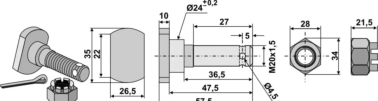 Blade screw M 20x1.5x47.5 - 12.9, with castle nut